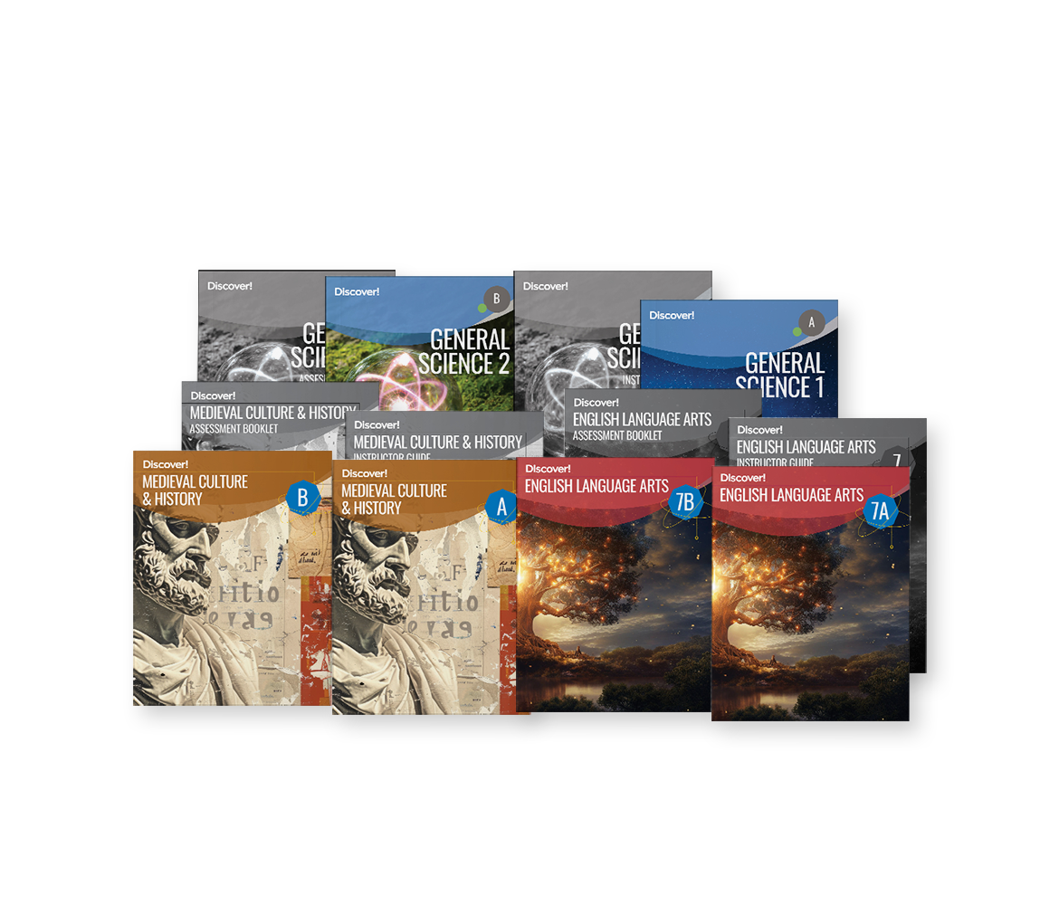 Seventh-grade students grow in independence and analytical thinking with the Discover! curriculum. Core subjects feature hands-on science labs, rich literature and writing, and an immersive study of medieval world history. Lessons build critical thinking, research skills, and global awareness while connecting academic content to real-world careers and creative exploration.